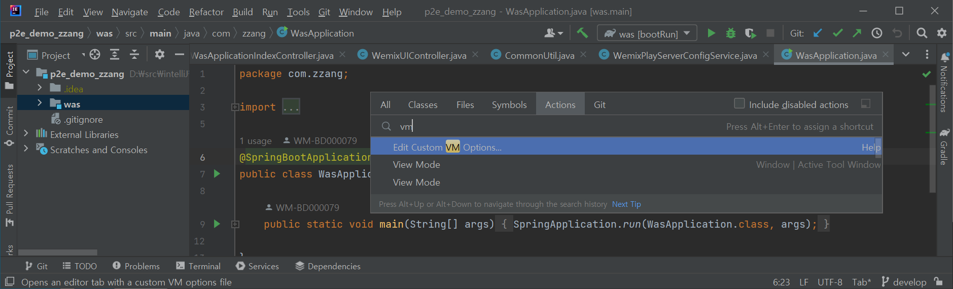 IntelliJ 에서 [ctrl + shift + A] 를 클릭하면 검색 창이 뜨는데 "vm" 을 검색하여 [Edit Custom VM Options...] 를 클릭하면 설정 파일 idea64.exe.vmoptions 을 열어 준다.