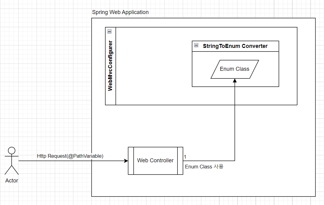 Converter 로 구현 되어 WebMvcConfigurer 에 의해 등록 된 Converter Bean 의 Enum Class는 Web Controller 에서 사용 될 때 Converter 가 적용 된다.